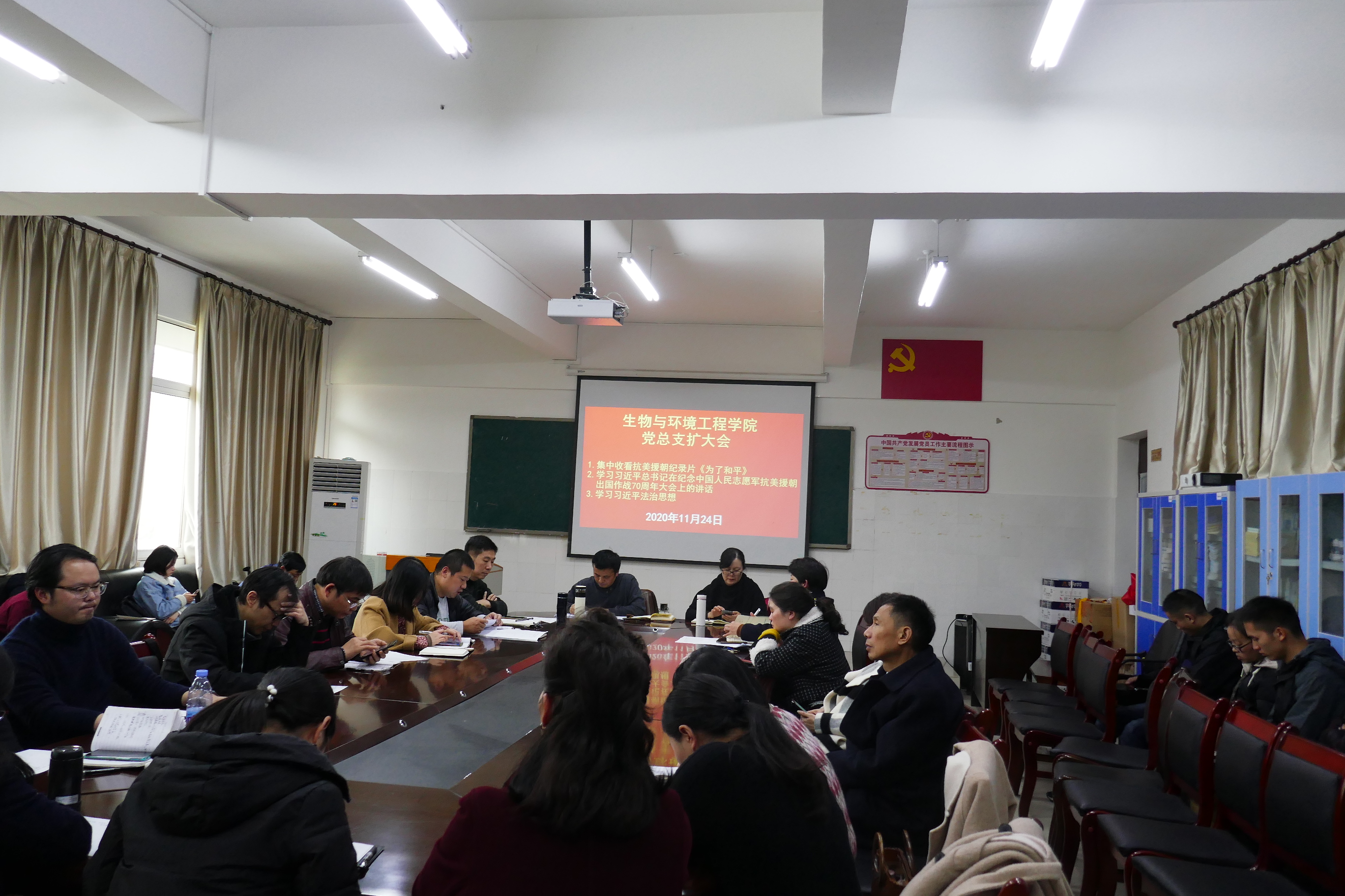 202011241300,生物与环境工程公司党总支召开扩大会议,集中收看《为了和平》,学习习近平总书记在纪念中国人民志愿军抗美援朝出国作战70周年大会上的讲话、学习习近平法治思想。公司教师党员、教师及员工党员参加会议。党总支书记唐运前主持会议,会议在党员活动室(A307室)举行。