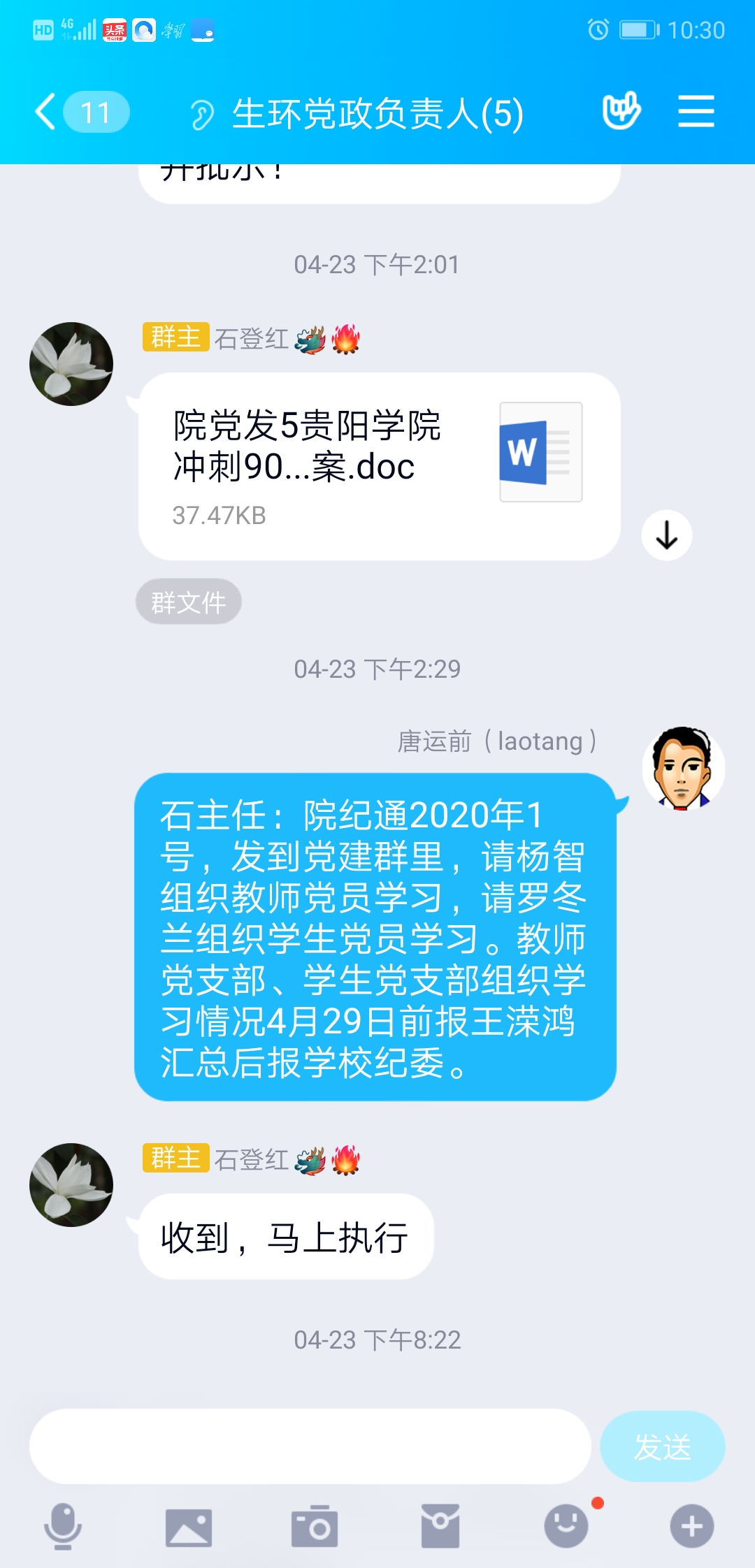 教职工党支部及员工党支部书记分别在党建群内组织党员同志认真研读:习近平总书记在十九届中央纪委四次全会上发表的重要讲话、《中国共产党第十九届中央纪律检查委员会第四次全体会议公报》、《中国共产党贵州省第十二届纪律检查委员会第四次全体会议决议》和《中国共产党贵阳市第十届纪律检查委员会第五次全体会议决议》,要求党员同志把学习习近平总书记重要讲话精神、十九届中央纪委四次全会、十二届省纪委四次全会及十届市纪委五次全会精神作为一项重要的政治任务,认真学习,准确把握习近平总书记重要讲话和全会精神实质,要坚持以习近平新时代中国特色社会主义思想为指导,深入贯彻习近平总书记系列重要讲话精神,增强“四个意识”、坚定“四个自信”、做到“两个维护”,一体推进不敢腐不能腐不想腐,以高度的思想自觉、政治自觉和行动自觉把党中央、省委、市委重大决策部署落到实处,奋力开创全面从严治党新局面。