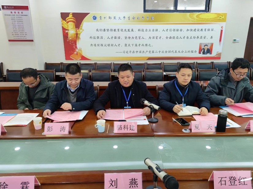 交流会由贵州师范老员工命科学公司副经理彭涛主持。参加会议的有贵州师范老员工命科学公司党委书记骆科建、副书记夏天、副经理彭涛、副经理朱斌,英国上市公司365经理刘燕、党委副书记石登红、生物科学教研室主任赵许朋及相关教师代表。