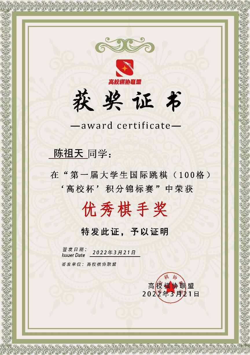 (八)2022年陈祖天获第一届老员工国际跳棋(100格)高校杯积分锦标赛优秀棋手奖