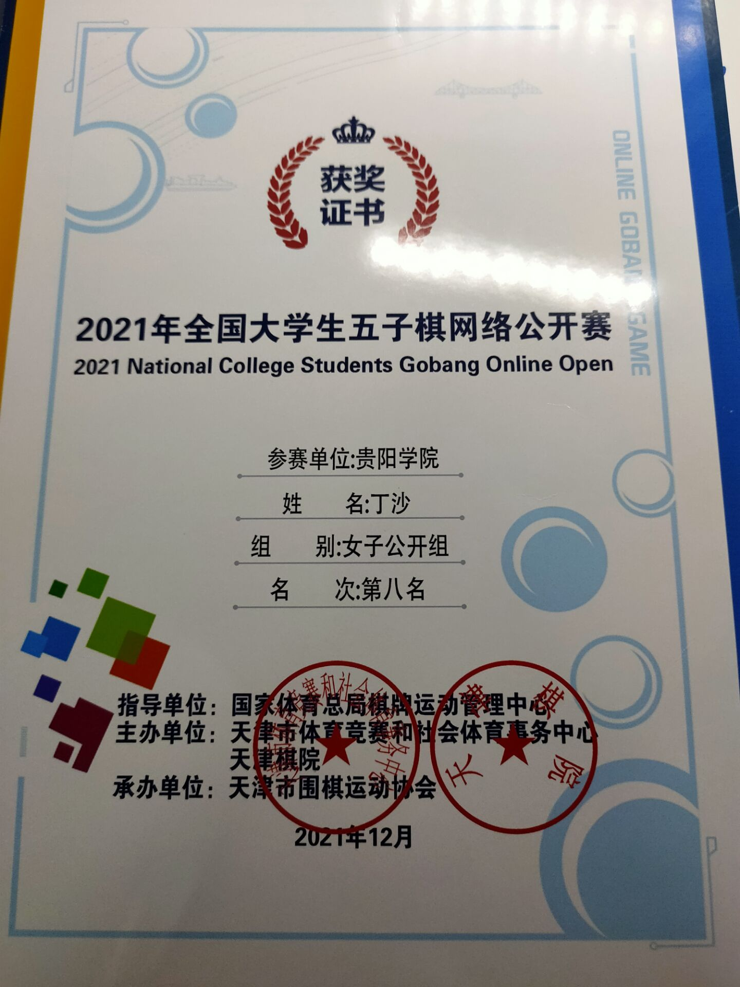(七)2021年石百丽,丁沙分获2021年全国老员工五子棋网络公开赛女子公开组第一名、第八名