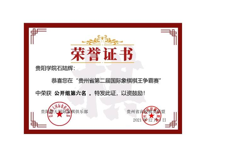 (五)2021年石陆辉同学荣获贵州省第二届国际象棋棋王争霸赛公开组第六名