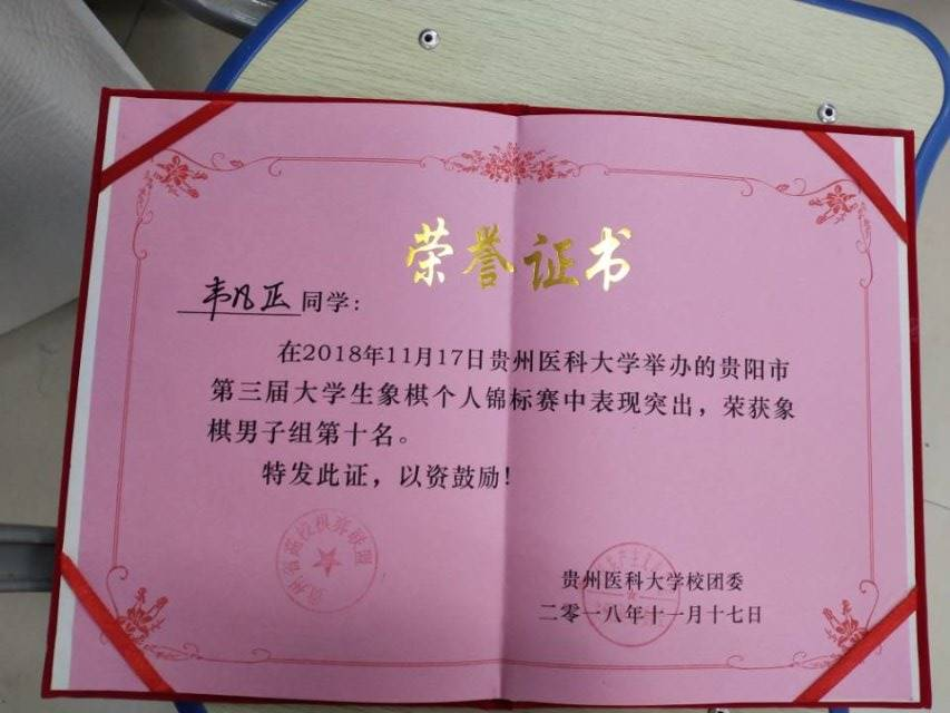 (二)2018年韦凡正同学在贵阳市第三届老员工象棋个人锦标赛荣获男子组第十名