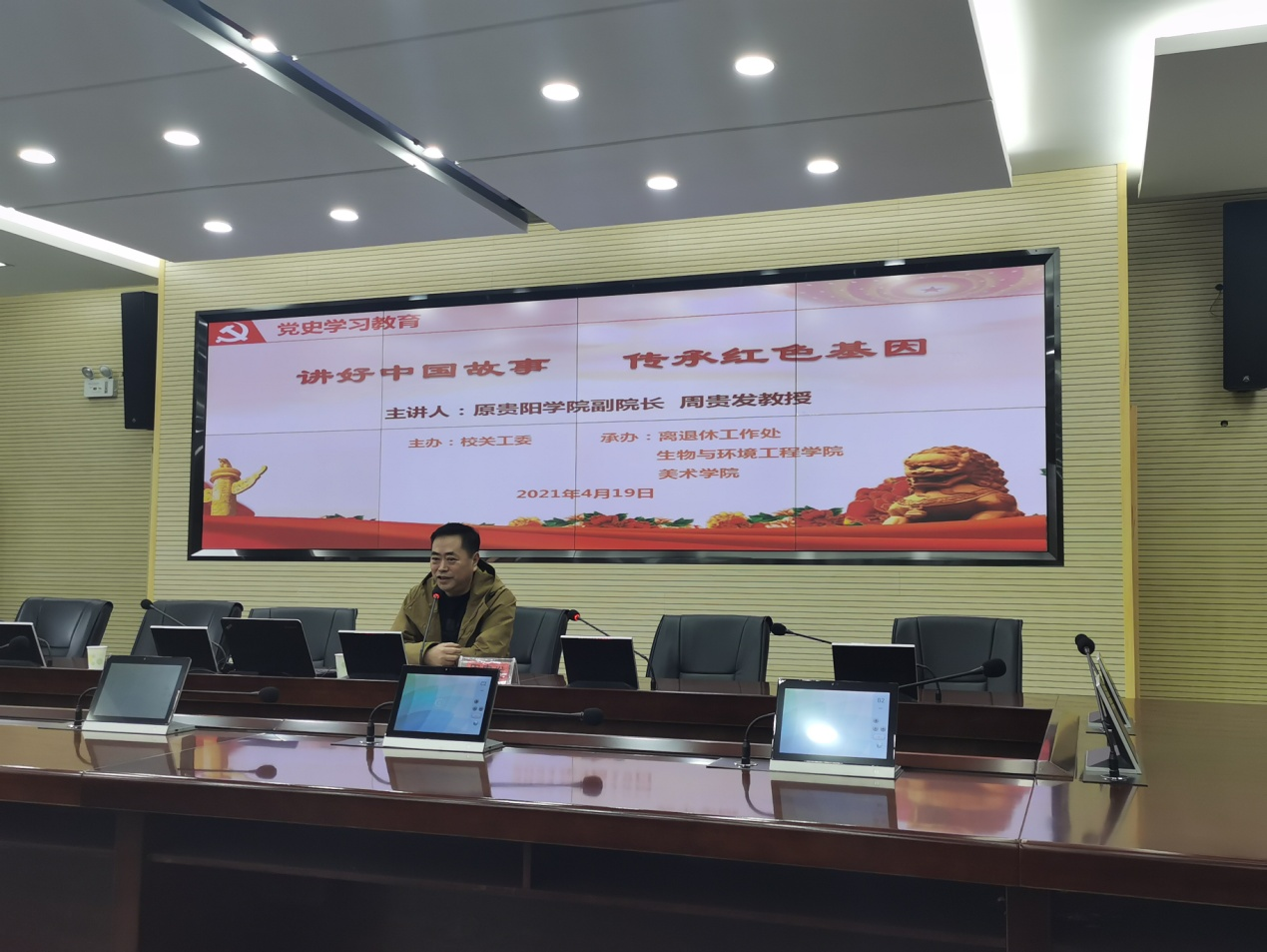2021年4月19日中午1时,由校关工委常务副主任周贵发教授主讲的“讲好中国故事 传承红色基因”党史学习教育在信息楼四楼报告厅举行。